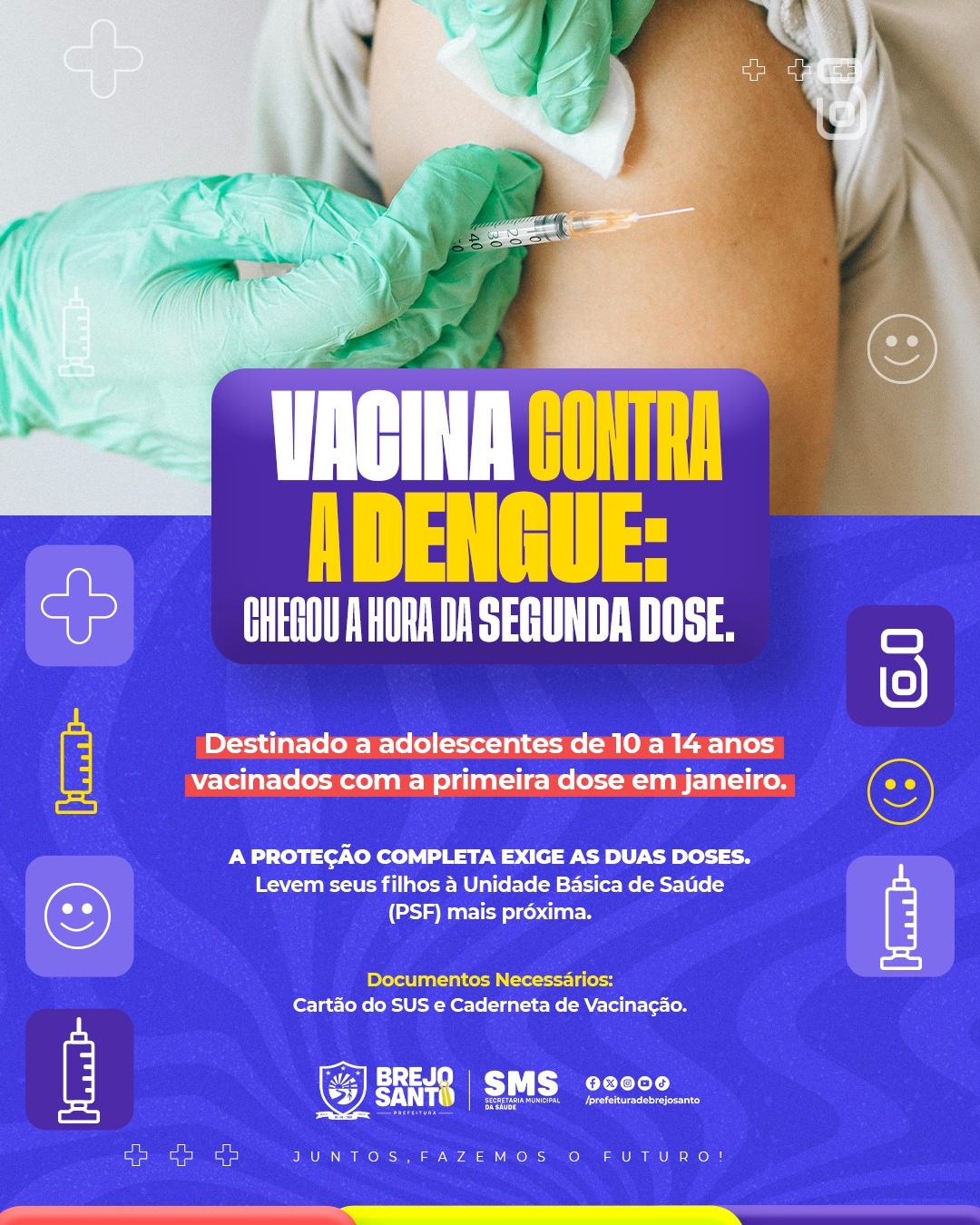 A Prefeitura de Brejo Santo, por meio da Secretaria Municipal de Saúde, deu início oficial à vacinação de rotina contra a dengue em todas as 23 Unidades Básicas de Saúde (PSFs) do município. Após o sucesso da mobilização no “Dia D”, o foco agora é garantir que o público-alvo, composto por crianças e adolescentes de 10 a 14 anos, complete o esquema vacinal para assegurar a proteção contra a doença.