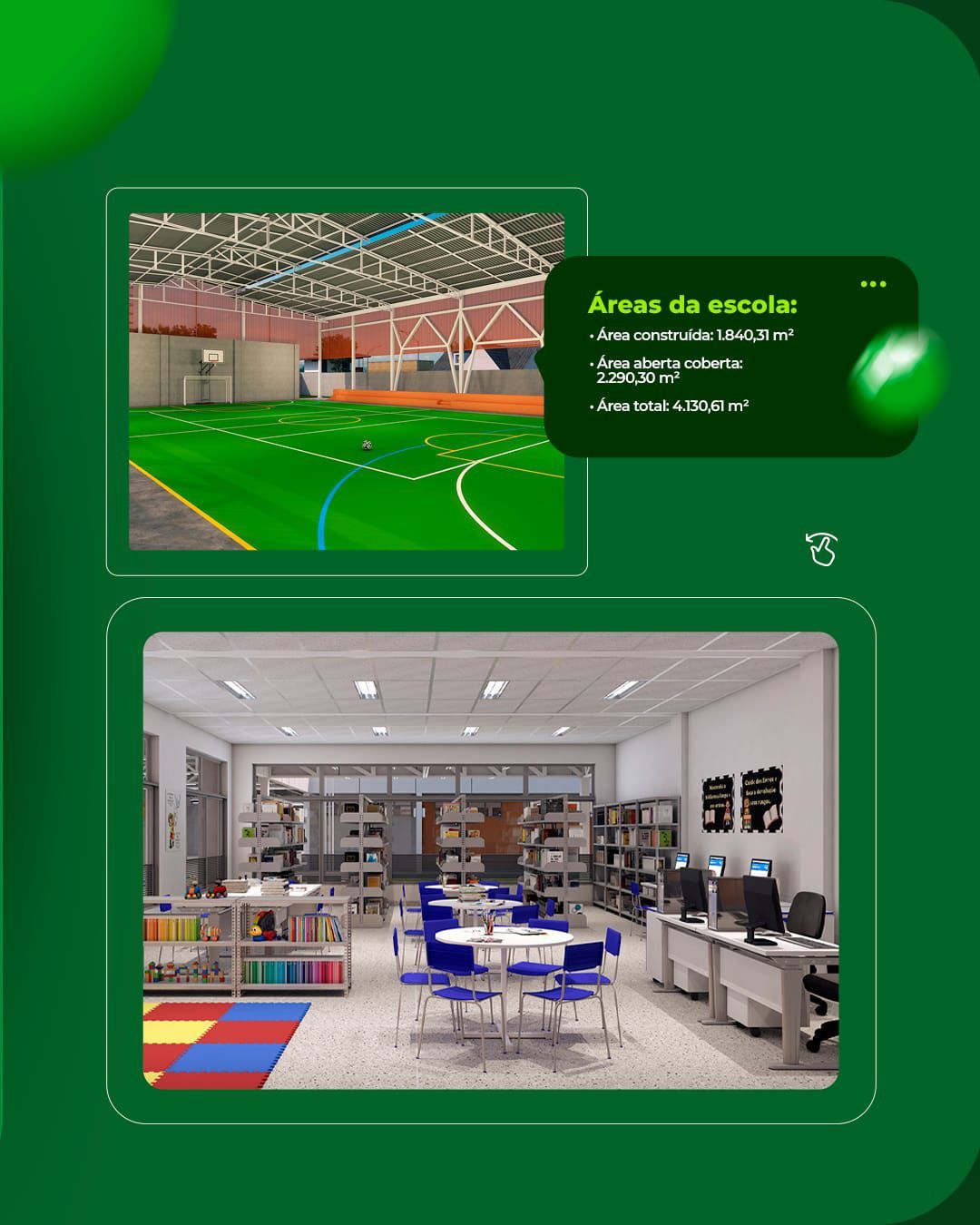 Com uma área total de 4.130,61 m², sendo 1.840,31 m² de área construída e 2.290,30 m² de área aberta coberta, a estrutura seguirá os padrões modernos de infraestrutura educacional, oferecendo ambientes acessíveis, funcionais e voltados à aprendizagem de qualidade.
