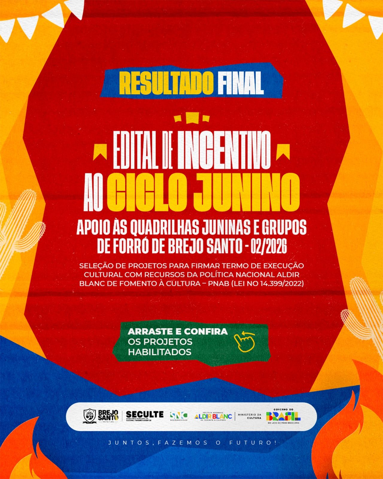A Prefeitura de Brejo Santo, por meio da Secretaria Municipal de Cultura, Turismo e Eventos (SECULTE), publicou nesta quarta-feira o resultado final do Edital nº 02/2026 – Incentivo ao Ciclo Junino. A iniciativa, viabilizada com recursos da Política Nacional Aldir Blanc (PNAB – Lei nº 14.399/2022), selecionou projetos voltados à preservação e fomento das tradições juninas no município.